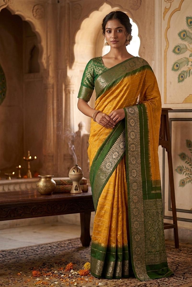 Do not hand wash and only dry-clean silk sarees. In case the saree gets stained, immediately wipe the stain off with cold water. Never hang a silk saree to dry in direct sunlight as doing so will cause the colour to fade.