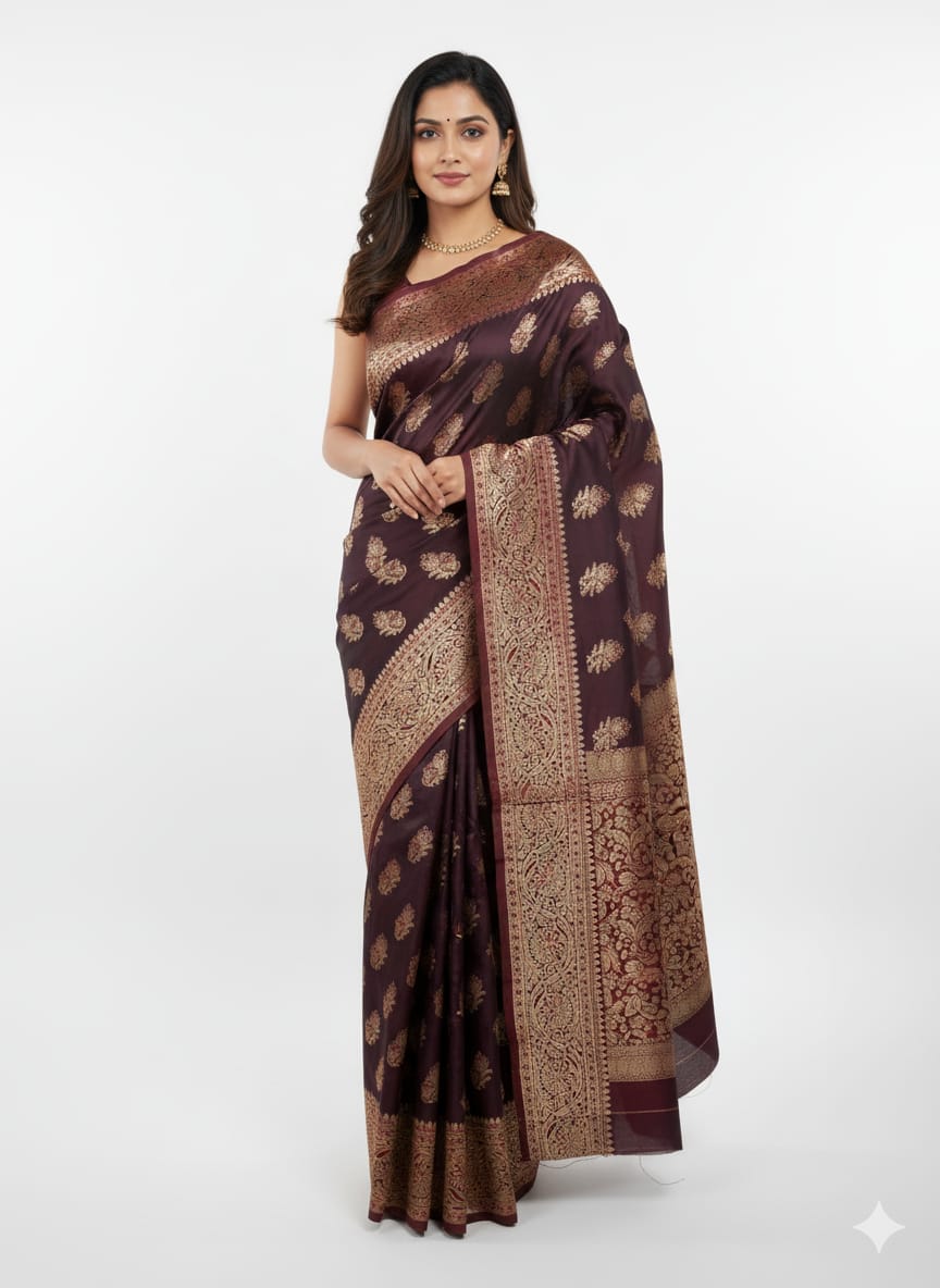 Beautiful soft satin silk saree with zari woven motifs and heavy pallu and border Dark Wine