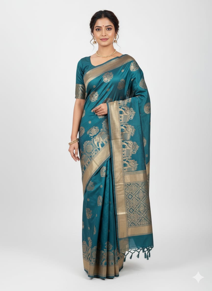 Beautiful soft satin silk saree with zari woven motifs and heavy pallu and border Teal Blue