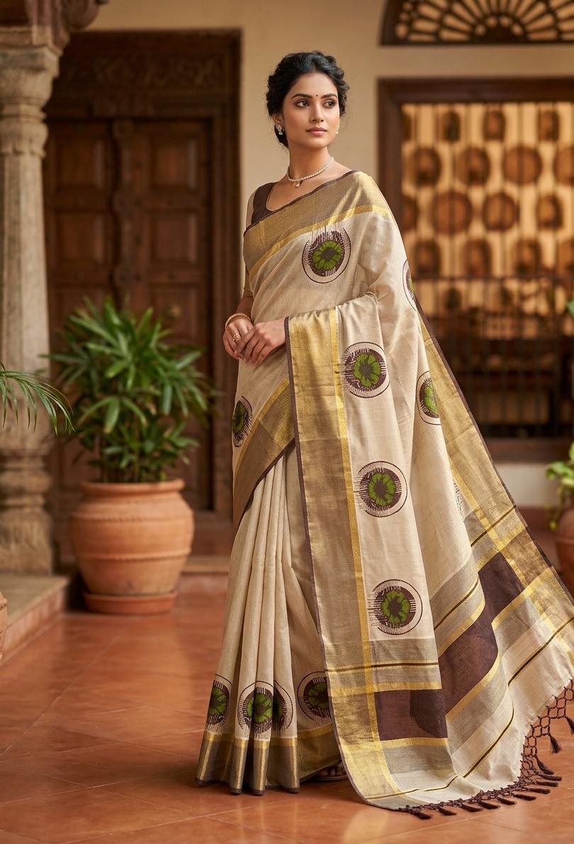 Floral printed kerala tissue saree with contrast border Brown