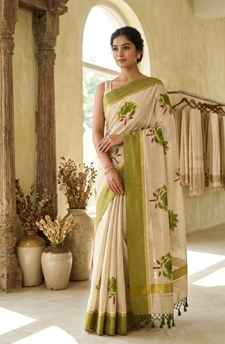 Floral printed kerala tissue saree with contrast border Light green