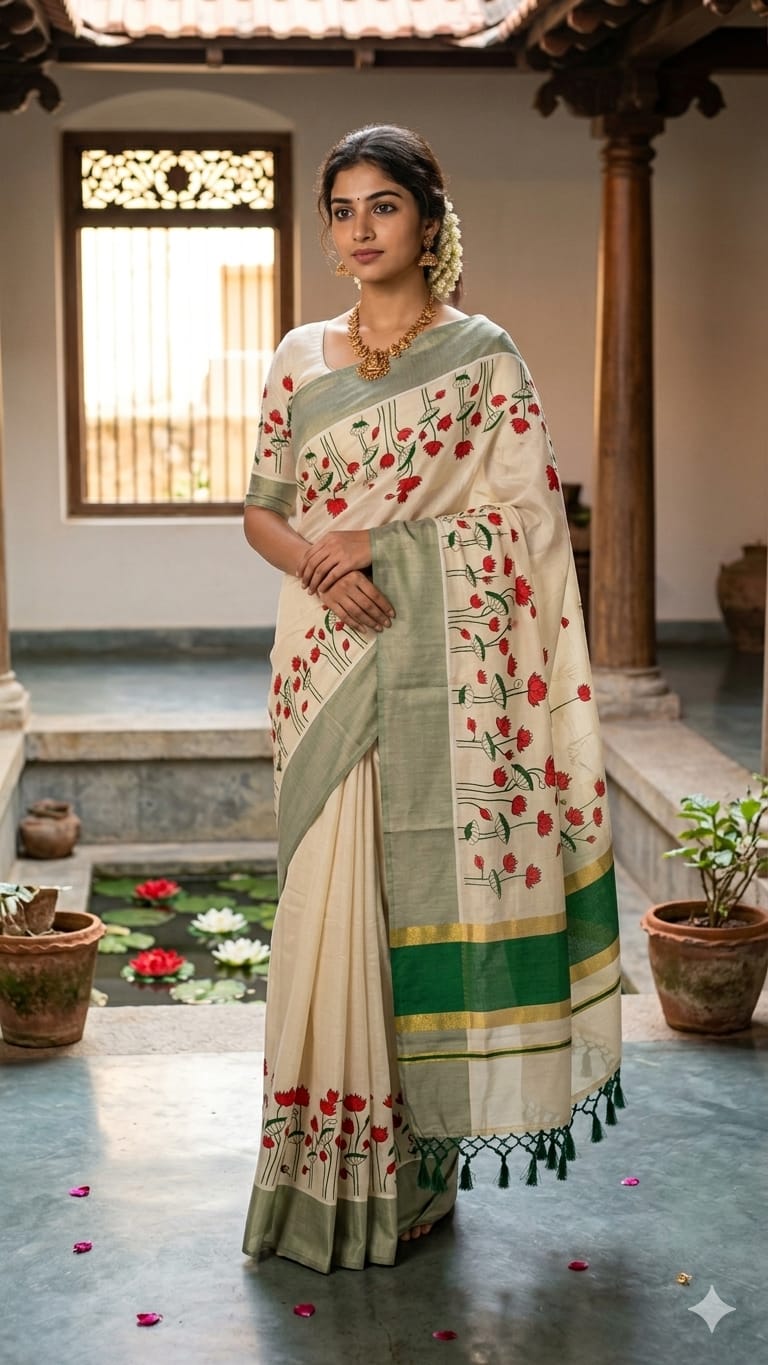 Floral printed traditional Kerala tissue saree with contrast border Green