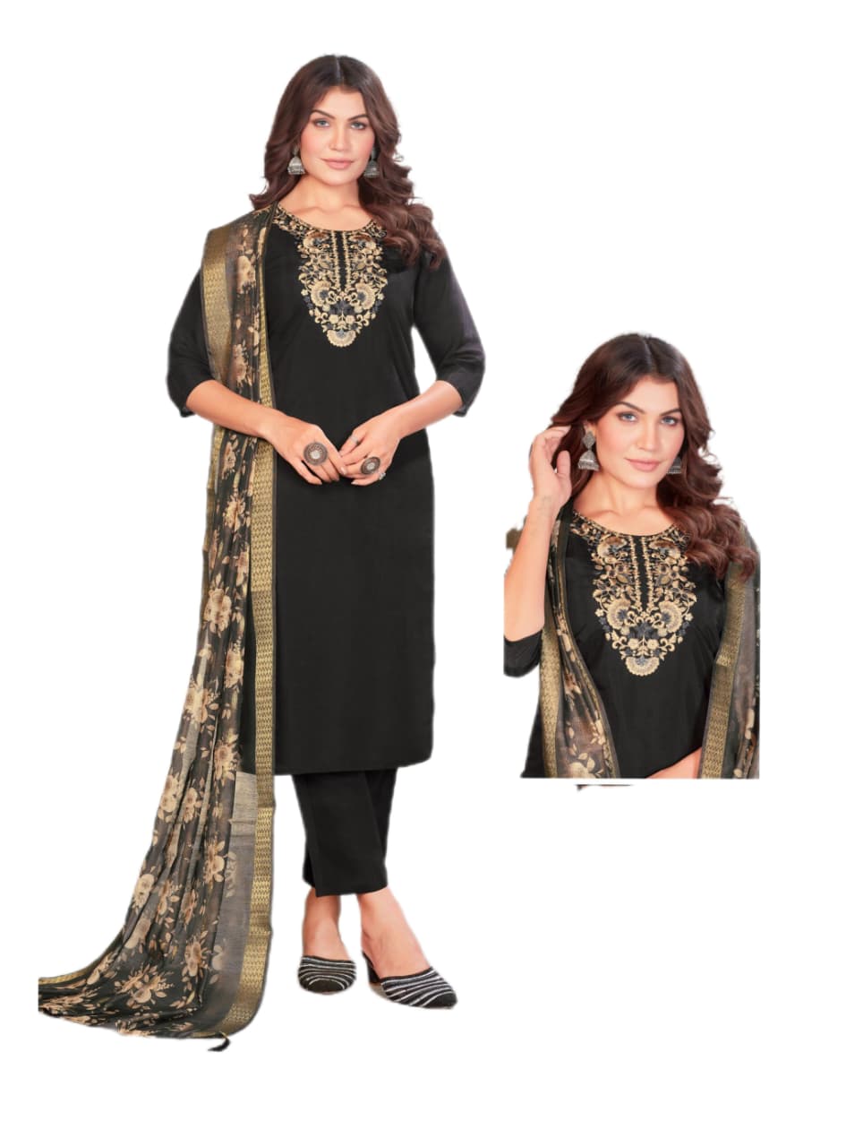 Embroidered roman silk suit with digital printed duppatta Black Size L