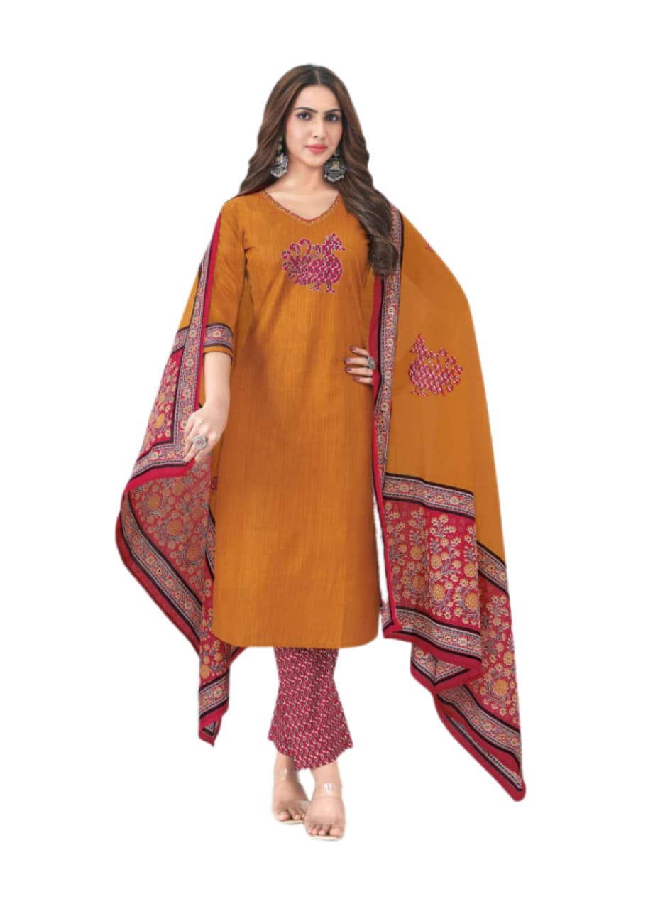 Cotton suit with katha work and mul cotton duppatta Orange Red