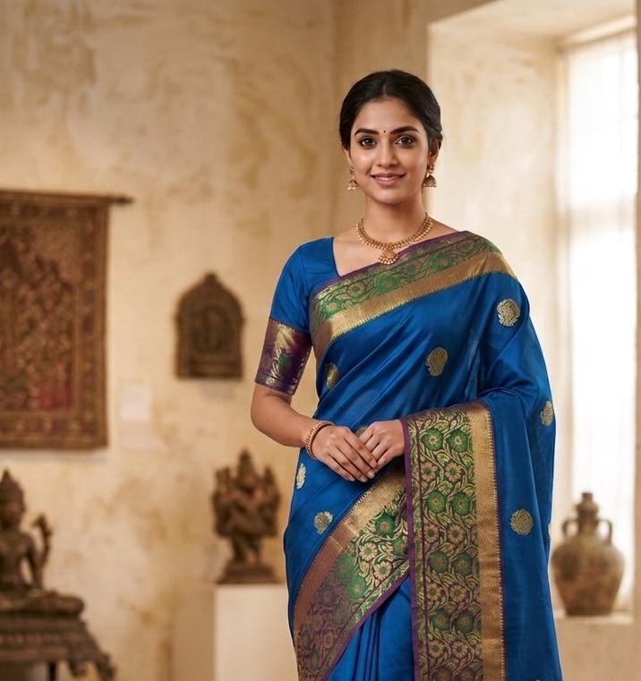 Ganga Jamuna Inspired premium silk zariwoven saree Deep Peacock Blue with Wine