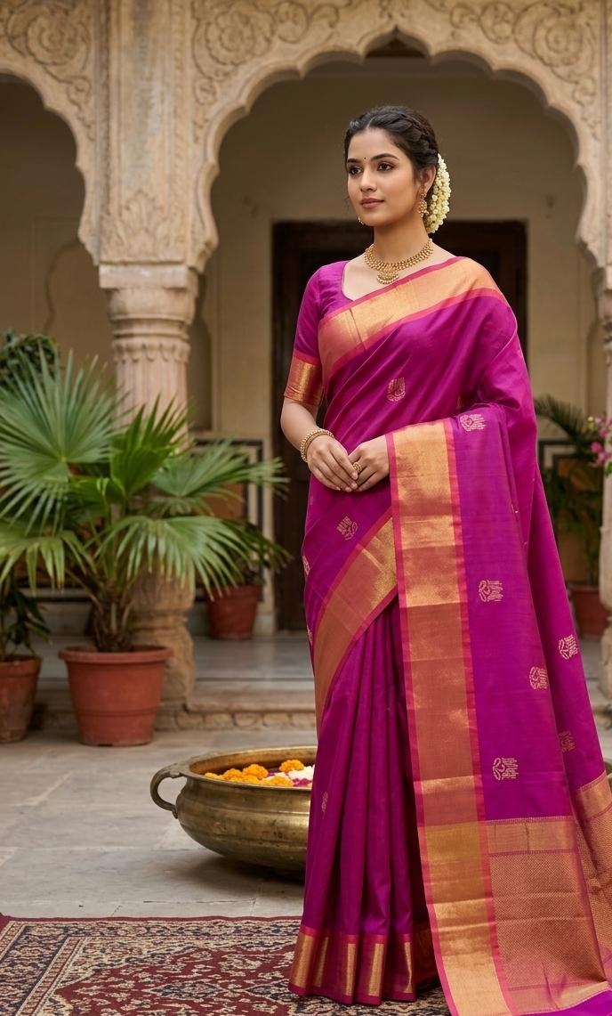 Rich Premium Kanhivaram Saree in Majenta hue adorned with golden floral motifs.