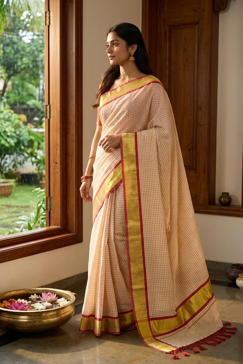 Traditional Kerala tissue silk check saree with colour kunjalam Red