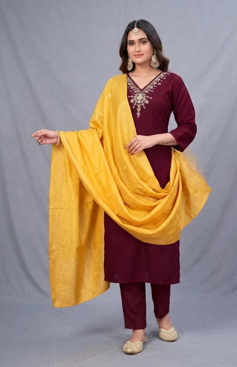 Roman silk suit with Khatli work Size S Maroon Yellow
